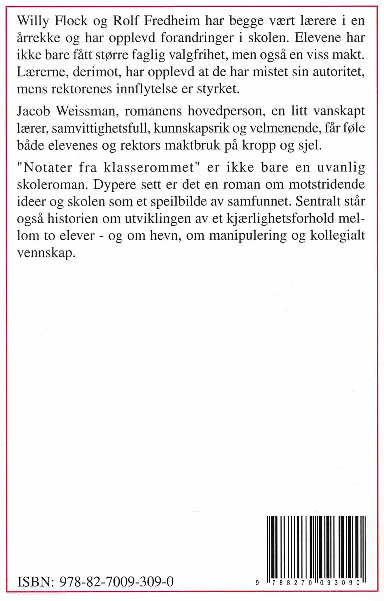 Willy Flock og Rolf Fredheim har begge vært lærere i en årrekke og har opplevd forandringer i skolen. Elevene har ikke bare fått større faglig frihet, men også en viss makt. Lærerne, derimot, har opplev at de har mistet sin autoritet, mens rektorens innflytelse er styrket. Jacob Weissman, romanens hovedperson, en litt vanskapt lærer, samvittighetsfull, kunnskapsrik og velmenende, får føle både elevens og rektors maktbruk på kropp og sjel. "Notater fra klasserommet" er ikke bare en uvanlig skoleroman. Dypere sett er det en roman om motstridende ideer og skolen som et speilbilde av samfunnet. Sentralt står også historien om utviklingen av et kjærlighetsforhold mellom to elever - og om hevn, om manipulering og kollegialt vennskap.